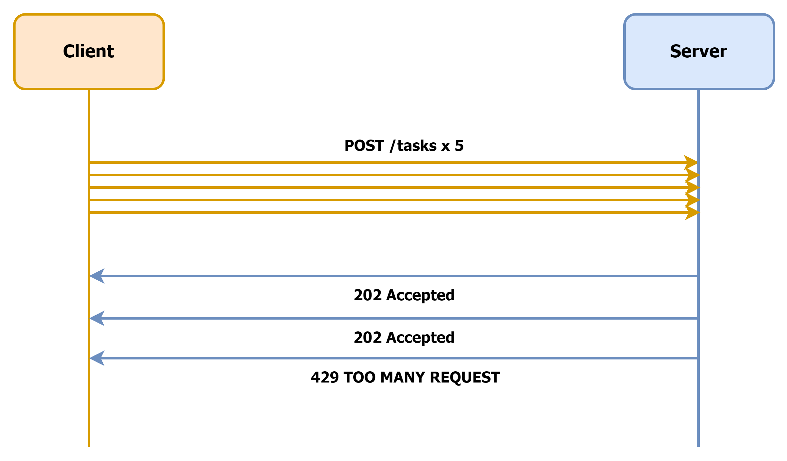 이를 예방하기 위해 Long-Running API에는 Rate Limit(처리율 제한)을 두는 것이 좋은데요. 최대 2회의 초당 요청을 허용하는 API로 간단한 예시를 들자면, 아래와 같은 요청-응답 플로우가 구성됩니다.