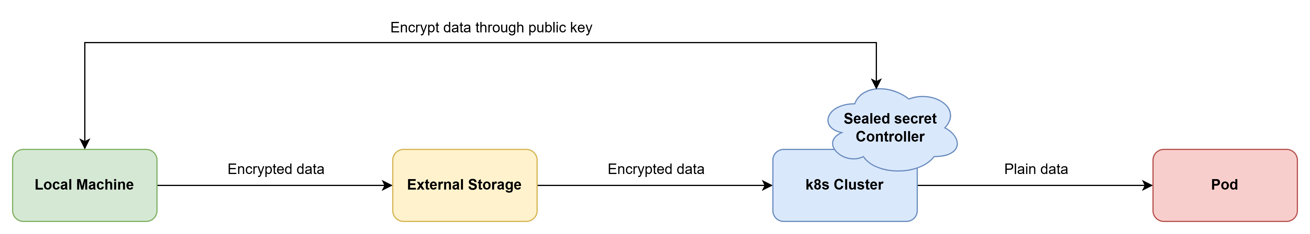 단순히 개념만 듣는다면, etcd에 암호화를 추가하는 것과 다를 게 뭐가 있는지, 오히려 외부 시스템을 추가하는 복잡함과 러닝커브만 감수해야 하는 게 아닌지 하는 생각이 들 수 있다. 하지만 위에서 다뤘던 flow가 Sealed secret을 적용하면 어떻게 변경되는지 확인해보자.