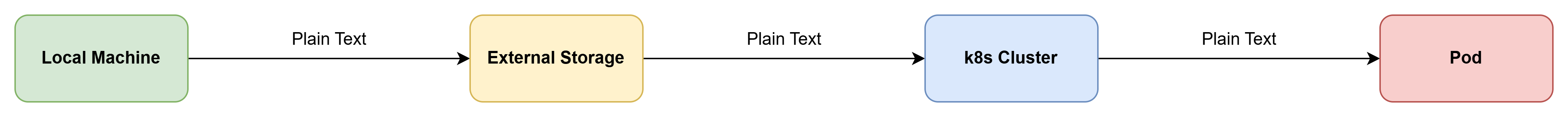 즉, 어느 단계에서든 데이터를 확인할 수 있으니 외부 저장소의 접근 권한, 클러스터 접근 권한, 각 단계의 통신의 도청자 등 다양한 사람이 민감 정보에 접할 수 있다. 가장 보안에 취약한 방법이라고 볼 수 있다. (애당초 민감 정보 저장용으로 정의된 리소스가 아니기도 하다.)