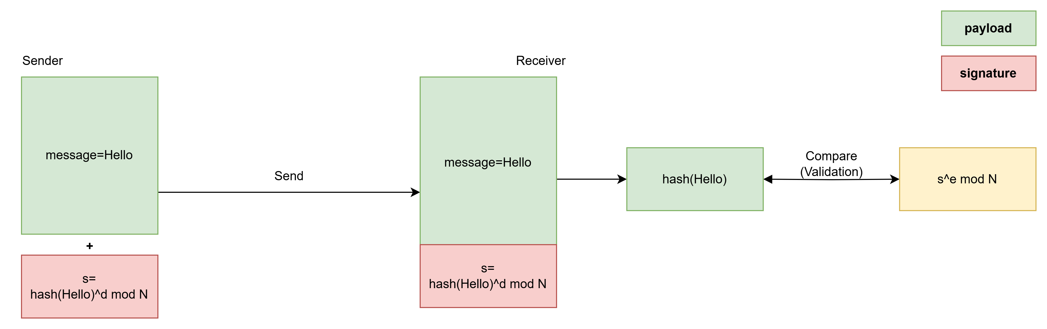 동작 방식은 RSA와 동일하다. 단, 서명과 검증에 아래와 같은 연산이 사용된다.