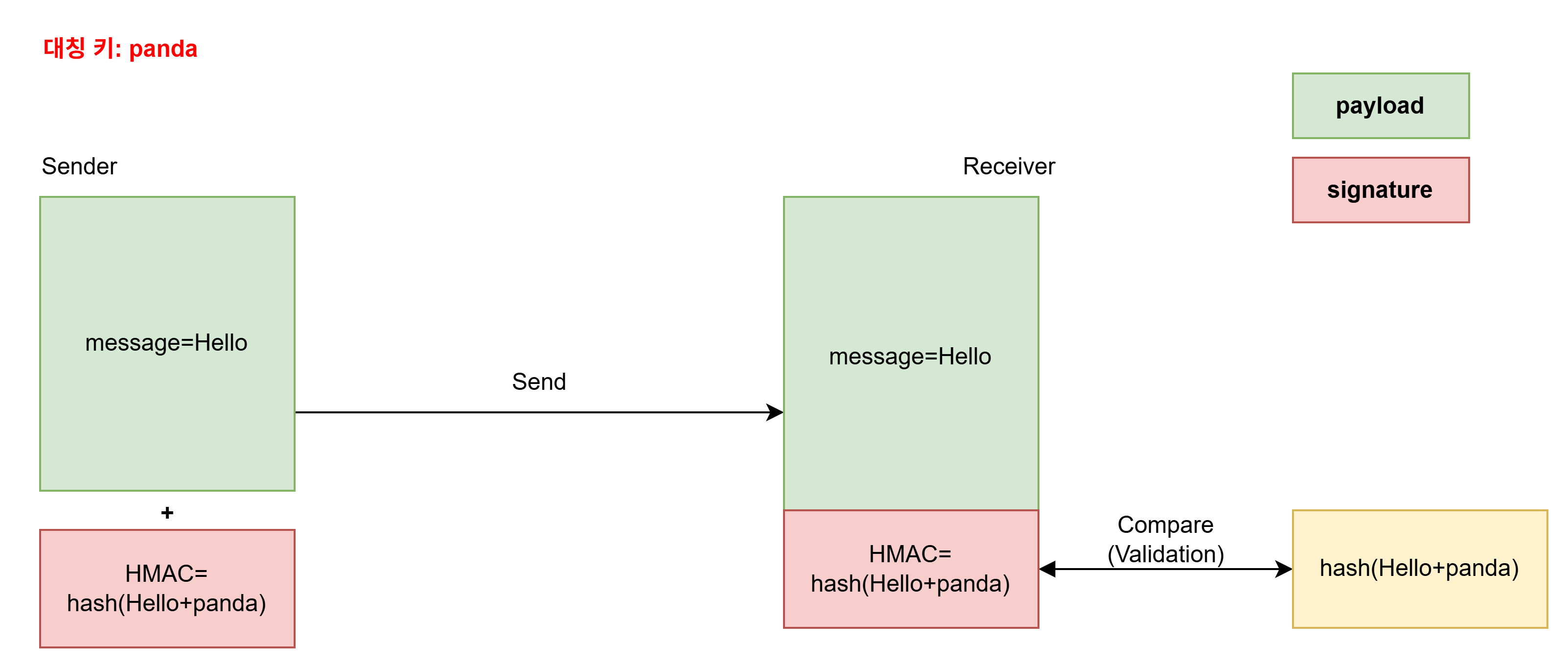 즉 여기서 Signature 역할을 하는 것은 메시지+키에 대한 해시 값인 HMAC이다.