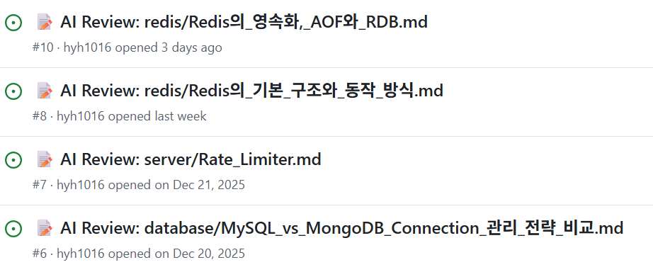 AI Reviewer는 학습 내용을 push하고 나면 아래와 같이 학습에 대한 리뷰 리포트를 GitHub Issue로 만들어 발행해주는 친구이다.
