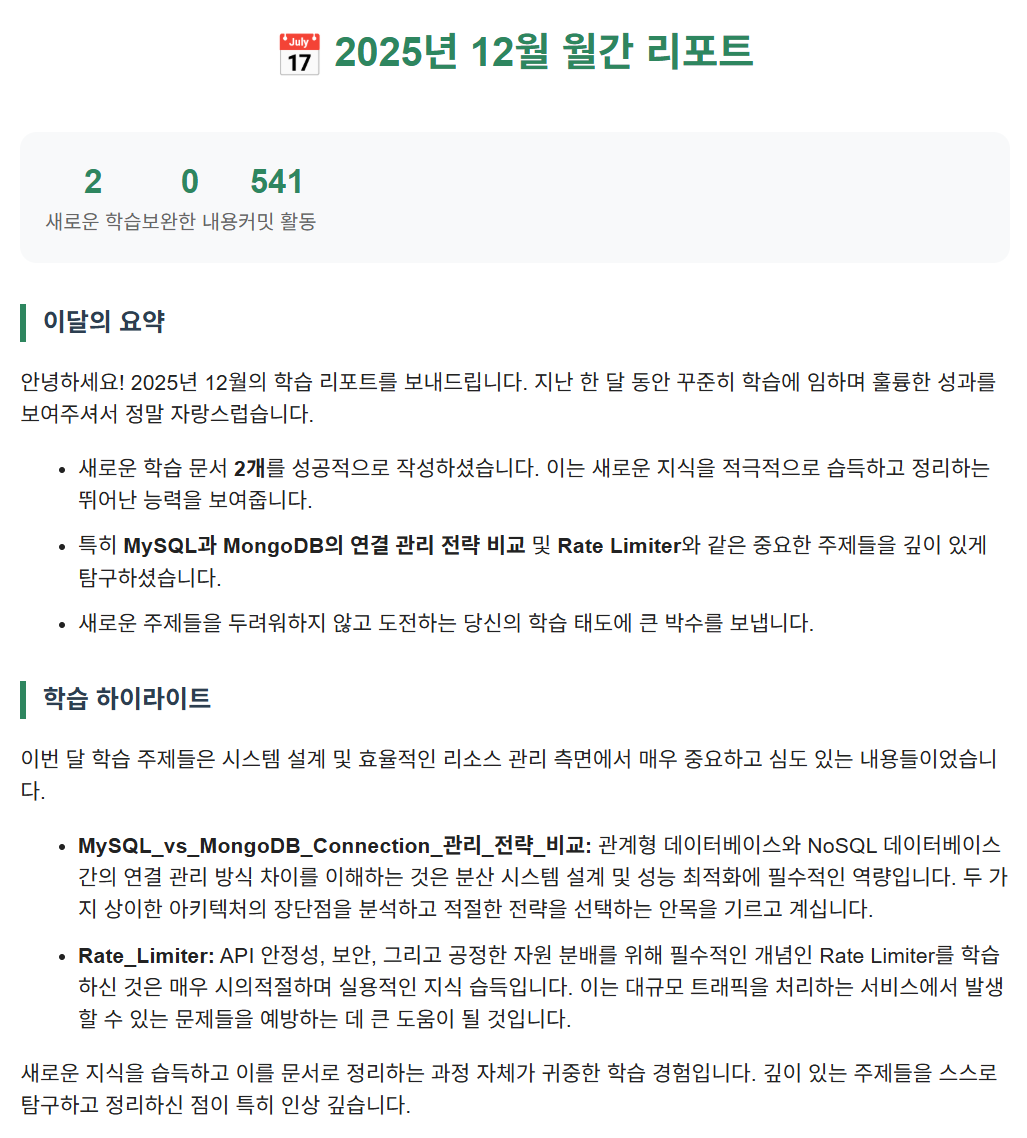 최근에 읽은 책에서 얻은 인사이트 중 하나가 성과를 눈에 보이게 해야 지속가능한 힘을 얻는다는 것이었는데, 이걸 TIL에도 도입하면 좋겠다 싶어 추가한 기능이 바로 이 월간 리포트이다.