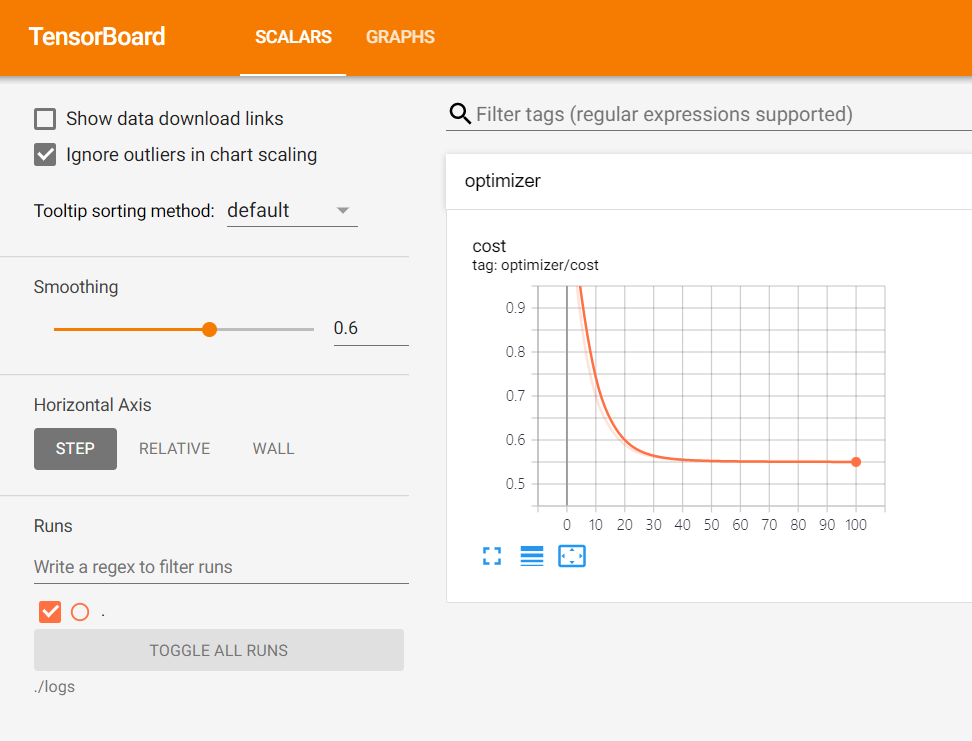 [SCALARS] 화면에서는 우리가 앞서 지정한 추적값인 Cost 값의 변화를 그래프로 보여주고 있다.