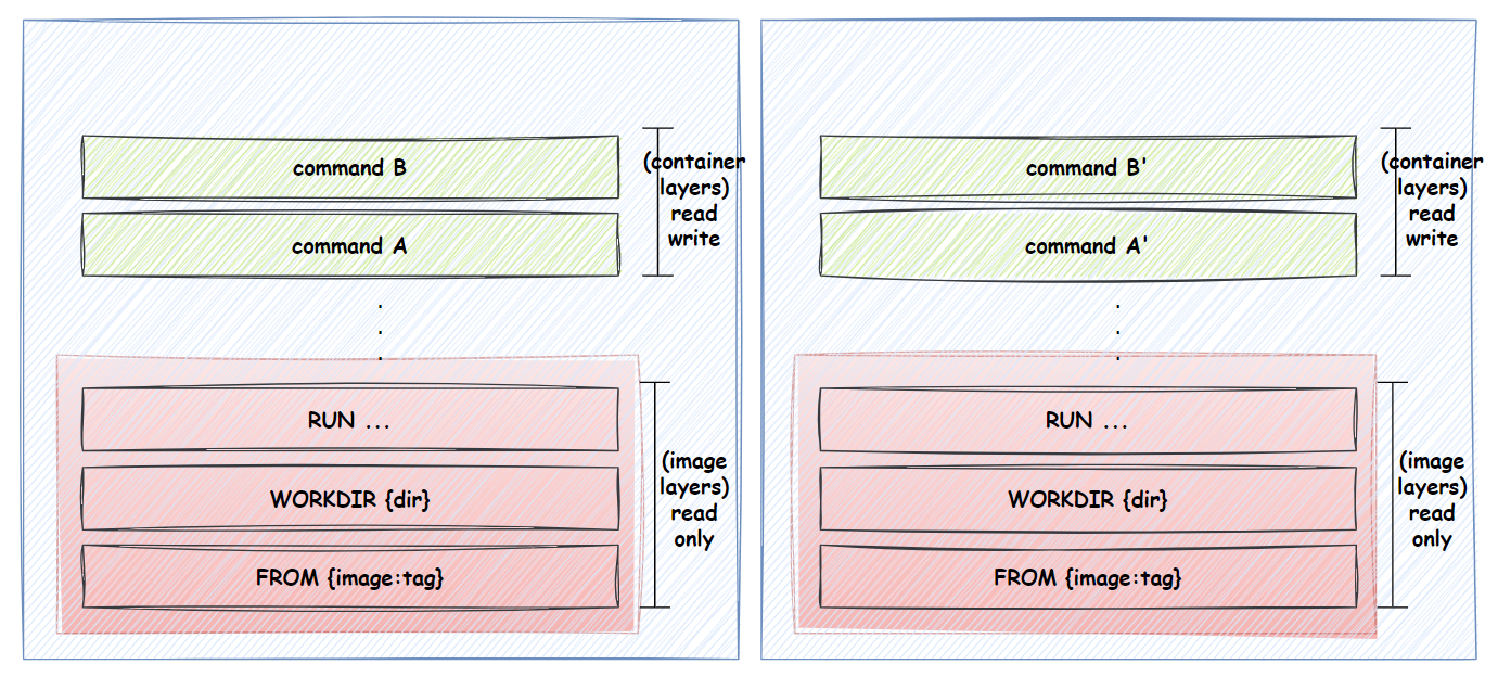 여기서FROM {image:tag} WORKDIR {dir} RUN commandWORKDIR라인을 변경하게 되면, 해당 라인부터 캐싱된 데이터를 invalidate 처리하고 다시 명령을 수행하게 된다. - 이러한 레이어 기반의 캐싱 방식에 주의하여 명령들의 위치를 잘 조정하는 것도 캐시를 효율적으로 사용하기 위한 중요한 체크포인트이다. 앞 단계에 자주 변경되는 명령이 위치하면 그 이후 단계에 생성되는 레이어들이 불필요하게 재생성되는 일이 생길 수도 있기 때문이다.