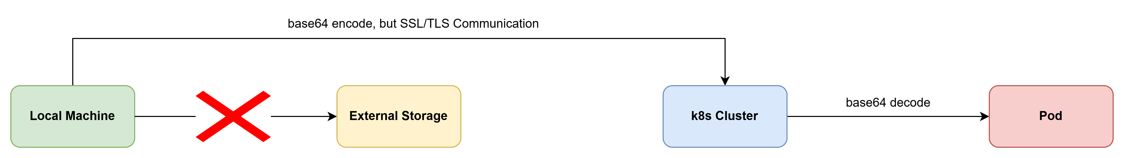 즉, 어느 단계에서든 데이터를 확인할 수 있으니 외부 저장소의 접근 권한, 클러스터 접근 권한, 각 단계의 통신의 도청자 등 다양한 사람이 민감 정보에 접할 수 있다. 가장 보안에 취약한 방법이라고 볼 수 있다. (애당초 민감 정보 저장용으로 정의된 리소스가 아니기도 하다.)